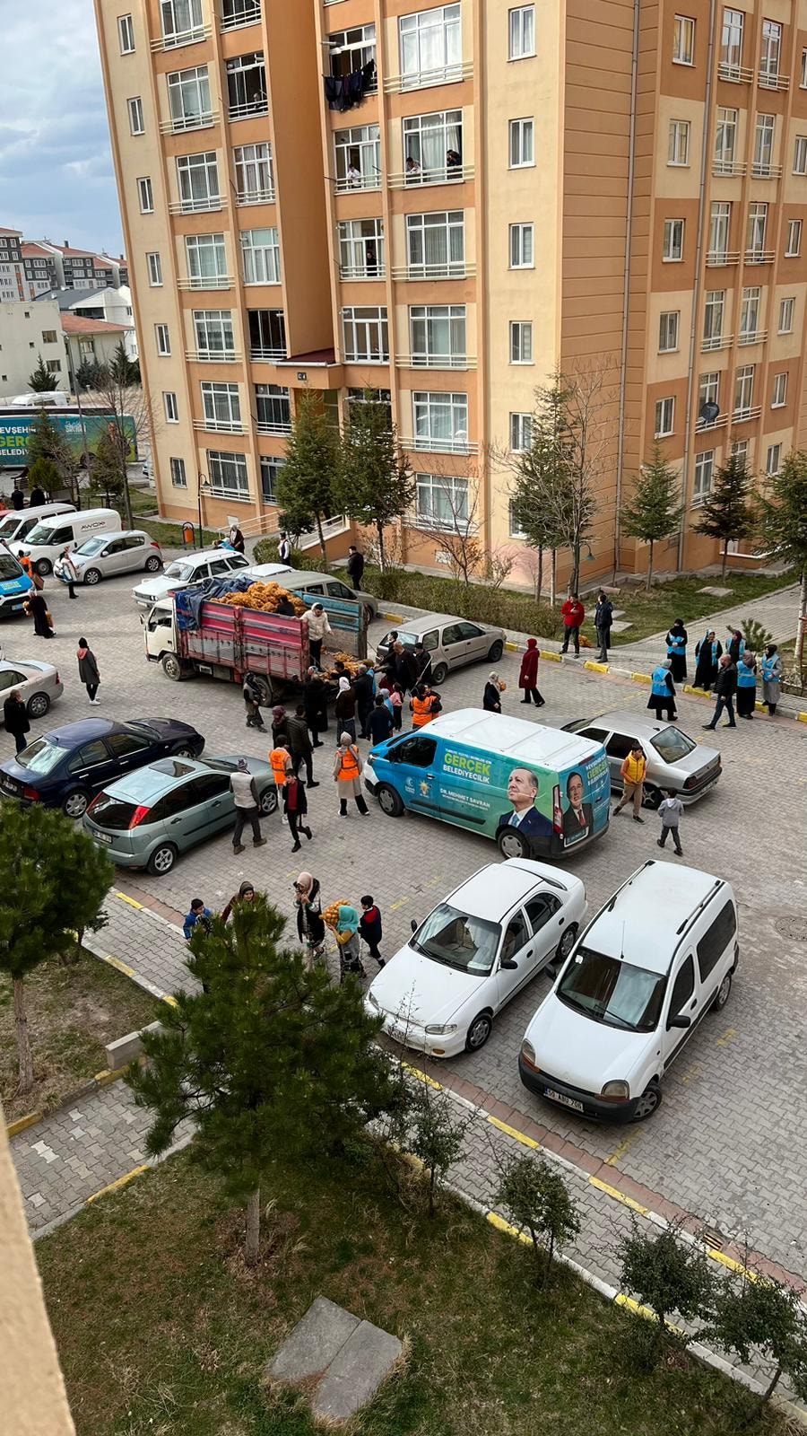 Parti 25 Mart’ta Nevşehir Mehmet Akif Ersoy Mahallesi’ndeki TOKİ konutlarında vatandaşlara kamyonla çuval çuval patates ve gıda kolisi dağıttı. Dağıtımı AKP’nin önlüklerini giyinen belediye personelleri yaptı.