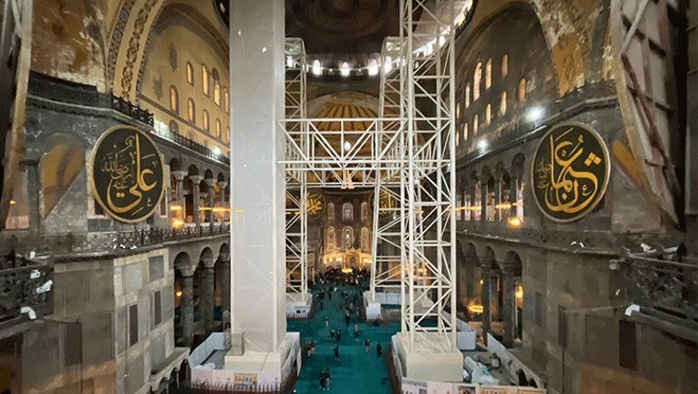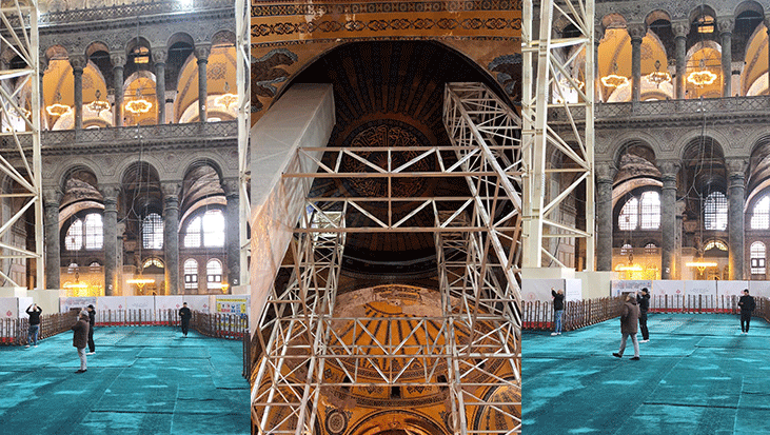İç mekanda, iskele kurulumu için kullanılan iş makineleri, görevlerini tamamladıktan sonra özel tasarlanmış rampa ve köprü sistemleriyle yapıya zarar verilmeden güvenle tahliye edildi. Bilim Kurulu tarafından süreç boyunca yapılan kesintisiz izlemelerde zeminde herhangi bir olumsuzluk tespit edilmedi. Gelinen aşamayla birlikte Ayasofya, Ramazan ayı öncesinde daha geniş bir ibadet alanıyla hazır hale geldi.