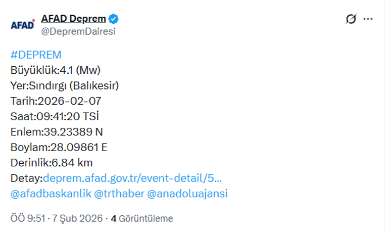 Haberler GÜNDEM Balıkesir Sındırgı’da 4.1 büyüklüğünde deprem Paylaş Bu Yazıyı Paylaş veya linki kopyala Kopyala Afet ve Acil Durum Yönetimi Başkanlığı (AFAD), Balıkesir’in Sındırgı ilçesinden 4.1 büyüklüğünde deprem meydana geldiğini bildirdi. Saat 09:41’de meydana gelen deprem, 6.84 kilometre derinlikte olduğu belirtildi.