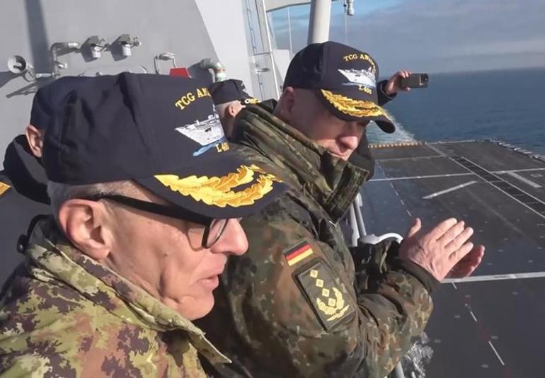 Tatbikat kapsamında TCG Anadolu gemisini ziyaret eden Gerhartz, burada yetkililerden faaliyetler hakkında bilgi aldı.