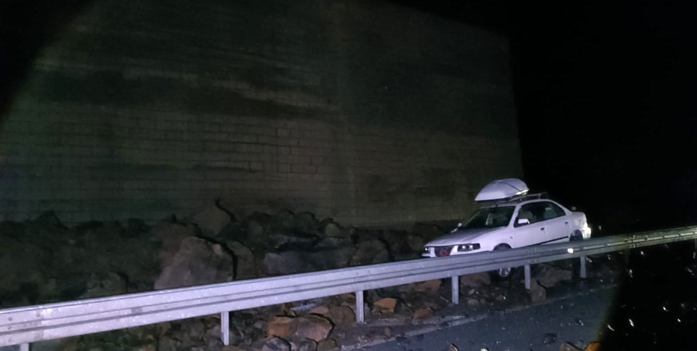 Heyelan sırasında yoldan geçen bir otomobildeki kişiler, düşen kaya parçalarının altında kalmaktan son anda kurtuldu.