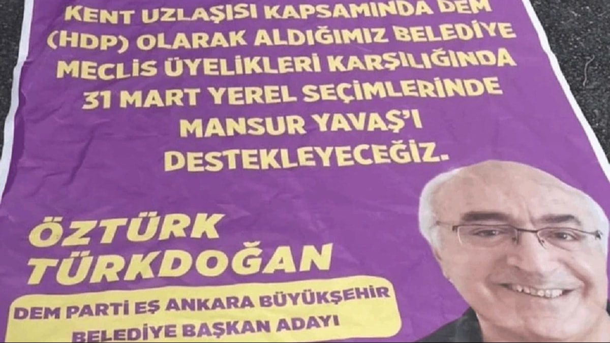 DEM Parti Ankara adayı Öztürk Türkdoğan, kendi adı ve fotoğrafıyla bastırılarak Başkent’in değişik semtlere asılan ve üzerinde “Kent Uzlaşısı kapsamında DEM Parti olarak aldığımız Belediye Meclis üyelikleri karşılığında 31 Mart yerel seçimlerinde Mansur Yavaş’ı destekleyeceğiz” yazılı afişleri kendilerine ait olmadığını açıkladı. Türkdoğan, kumpas afişleriyle ilgili suç duyurusunda bulunacağını belirtti. Afişleri kimin bastırıp astırdığını bilmediklerini kaydeden Türkdoğan, “Burada amaç, milliyetçi oyların Mansur Yavaş’a gitmesini engellemek” dedi ve şunları söyledi: