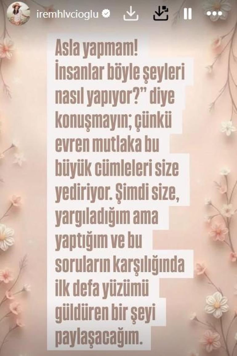 Ardından ise oyuncu, kendisini aldattığı iddia edilen eşiyle ilgili imalı bir paylaşımda bulundu. Helvacıoğlu, “Asla yapmam! İnsanlar böyle şeyleri nasıl yapıyor?” diye konuşmayın, çünkü evren mutlaka bu büyük cümleleri size yediriyor. Şimdi size, yargıladığım ama yaptığım ve bu soruların karşılığında ilk defa yüzümü güldüren bir şeyi paylaşacağım.” ifadelerini kullandı.
