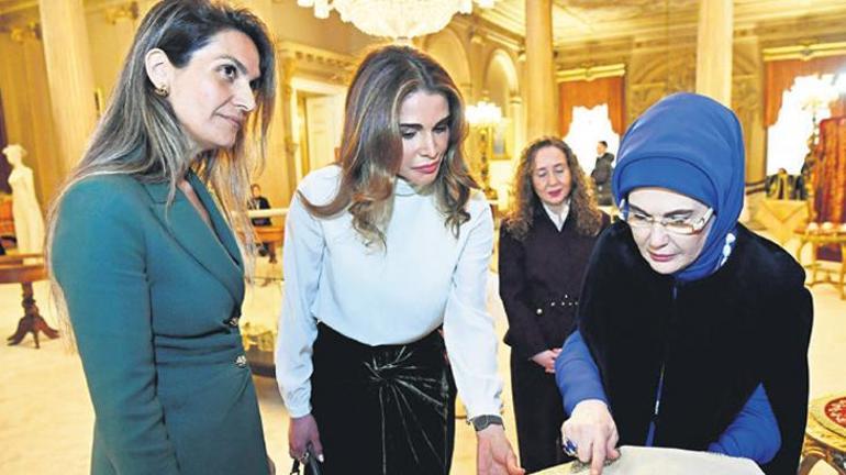 Cumhurbaşkanı Recep Tayyip Erdoğan’ın eşi Emine Erdoğan, Ürdün Kraliçesi Rania Al Abdullah’ı Dolmabahçe Sarayı’nda ağırladı. Emine Erdoğan ve Al Abdullah birlikte Olgunlaşma Enstitüsü tarafından 1. Binek Salonu’nda düzenlenen kumaş üzeri renkli iplikler, işlemeler, resimler, el yazması kitaplar ve minyatür benzeri eserlerin yer aldığı “Tabiatın Ahenginden Kültürel Hafızaya: Nakş-ı Zaman Sergisi”ni gezdi.