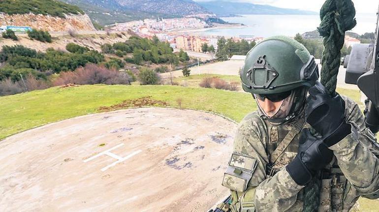 Helikoptere, komando timi ile birlikte bindik. HATU denilen helikopterden atma ve toplama uzmanlığı eğitimini, havada helikopterin içinden izledik. Komandolar, havada asılı duran helikopterden halatlara tutunarak çabuk iniş (fastrope) yaptı. Komandolar tahliye sırasında yine aynı şekilde halat ile helikoptere çıkıyor. Eğitim subayı, “Komandolarımız bu teknik ile helikopterin iniş yapmasının mümkün olmadığı bölgelere süratle personeli indirerek operasyonun güvenliğini ve hızını arttırıyor. Komandolar, bir kaç saniye içerisinde metrelerce yükseklikten halat yardımıyla yere iniyorlar. Komandolarımız helikopterin iniş yapmasının mümkün olmadığı sarp arazi koşullarında ise dağ ipi ile kontrollü iniş tekniğini icra ediyorlar. Bu teknik çabuk inişe göre daha güvenli ve kontrollü bir yöntem olarak özellikle yüksek kayalıklar, dağlık bölgeler veya dar geçitlerde tercih ediliyor” dedi.