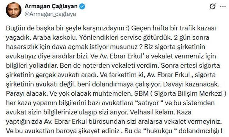 Sosyal medyada yaşadıklarını anlatan Çağlayan, “Bugün de başka bir şeyle karşınızdayım :) Geçen hafta bir trafik kazası yaşadık. Araba kaskolu. Yönlendikleri servise götürdük. 2 gün sonra hasarsızlık için dava açmak istiyor musunuz ? Biz sigorta şirketinin avukatıyız diye aradılar bizi. Ve Av. Ebrar Erkul’ a vekalet vermemiz için bilgileri yolladılar. Ben de noterden vekaleti verdim. Sonra ertesi sigorta şirketinin gerçek avukatı aradı. Ve farkettim ki, Av. Ebrar Erkul , sigorta şirketinin avukatı değil, beni dolandırmaya çalışıyor. Davayı kazanacak. Parayı alacak. Ve yok olacak muhtemelen. SBM ( Sigorta Bilişim Merkezi ) her kaza yapanın bilgilerini bazı avukatlara “satıyor “ ve bu sistemden avukat sizin bilgilerinize ulaşıp sizi arıyor. Velhasıl kelam. Kaza yaptığınızda Av. Ebrar Erkul bürosundan sizi ararsa vekalet vermeyiniz. Ve bu avukatları baroya şikâyet ediniz. Bu da “hukukçu “dolandırıcılığı!” dedi.