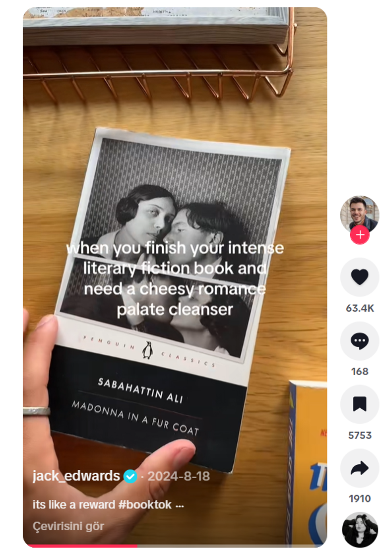 Romanın yeniden gündeme gelmesinde TikTok’un kayda değer bir payı bulunuyor. Öyle ki, İngiltere’nin en tanınan kitap içerik üreticilerinden Jack Edwards, yayınladığı videoda Kürk Mantolu Madonna’yı “ruhun penceresi” olarak tanımladı. Edwards’ın videoları milyonlarca kişiye ulaştı ve elbette kitabın satışlarını da doğrudan etkiledi.