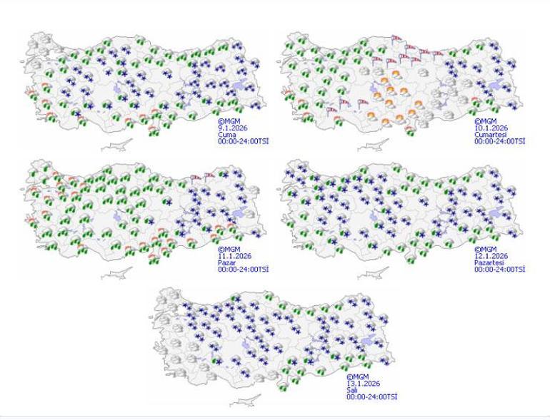 Meteoroloji Genel Müdürlüğü tarafından yapılan tahminlere göre: Ülkemiz genelinin parçalı ve çok bulutlu, Ege, Akdeniz, İç Anadolu, Karadeniz, Doğu ve Güneydoğu Anadolu ile Kocaeli, Yalova, Bursa, Bilecik ve Sakarya çevrelerinin aralıklı yağışlı geçeceği tahmin ediliyor. Yağışların Akdeniz kıyıları, Karadeniz kıyıları, Güneydoğu Anadolu’nun güneyi ile Denizli, Amasya, Tokat, Şırnak ve Siirt çevrelerinde yağmur ve sağanak, yağış alan diğer yerlerde karla karışık yağmur ve kar şeklinde olması bekleniyor. Yağışların, Doğu Karadeniz, Doğu Anadolu’nun kuzey ve doğusu (Iğdır, Kars, Ağrı, Van ve Ardahan hariç) ile Hatay, Osmaniye ve Ordu çevrelerinde yer yer kuvvetli olacağı tahmin ediliyor. Sabah ve gece saatlerinde iç ve doğu kesimlerde buzlanma ve don olayı bekleniyor. Doğu Karadeniz’in iç kesimlerinin yüksekleri ile Doğu Anadolu’nun doğusunun yüksek kar örtüsüne sahip eğimli kesimlerinde çığ tehlikesi bulunmaktadır.