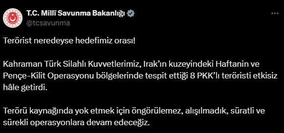 “Terörist neredeyse hedefimiz orası! Kahraman Türk Silahlı Kuvvetlerimiz, Irak’ın kuzeyindeki Haftanin ve Pençe-Kilit Operasyonu bölgelerinde tespit ettiği 8 PKK’lı teröristi etkisiz hâle getirdi.