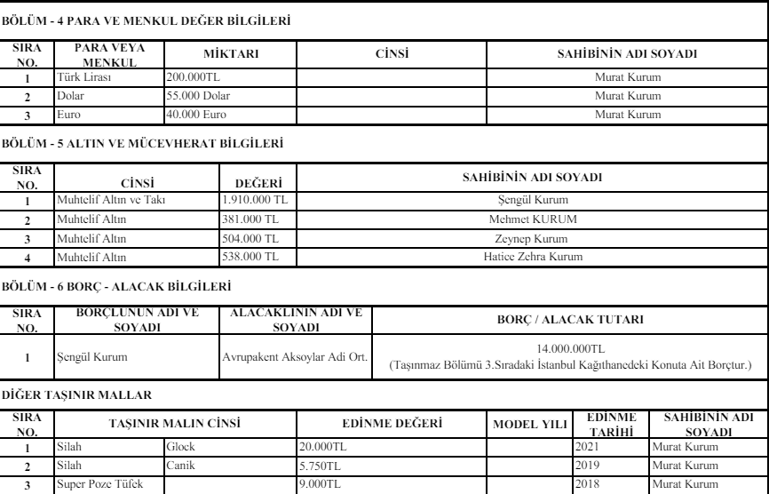 Kurum’un Ankara Çankaya’da kendi adına bir evi, Şengül Kurum’un annesi ve babası için aldığı Ankara Altındağ’da bir evi, yine İstanbul Kağıthane’de oturdukları bir evleri bir de arabaları bulunuyor.