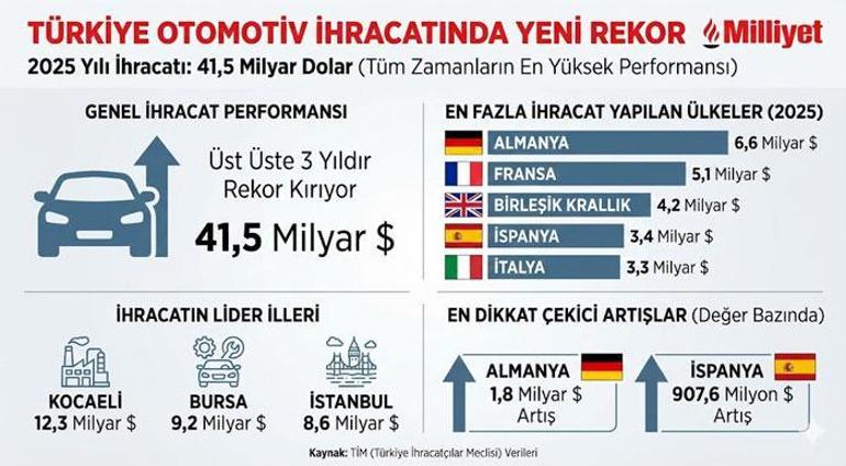 Sektörün ana pazarı Almanya, ilk sıradaki yerini korumaya devam etti. Geçen yıl Almanya’ya yapılan otomotiv ihracatı 2024’e kıyasla yüzde 36 artarak 4 milyar 854 milyon 656 bin dolardan 6 milyar 611 milyon 618 bin dolara yükseldi.