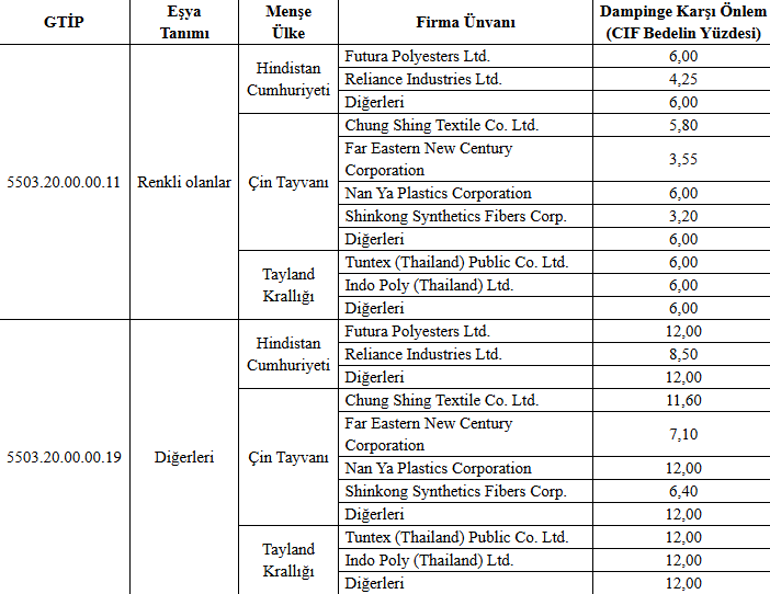 Diğer polyester elyaf ürünlerinde ise Hindistan menşeli ürünlerin ithalatında dampinge karşı önlem CIF bedelinin yüzde 8,5 ila yüzde 12’si, Tayvan menşeli ürünlerin ithalatında yüzde 6,4 ila yüzde 12’si, Tayland menşeli ürünlerin ithalatında da yüzde 12’si oranında uygulanacak.