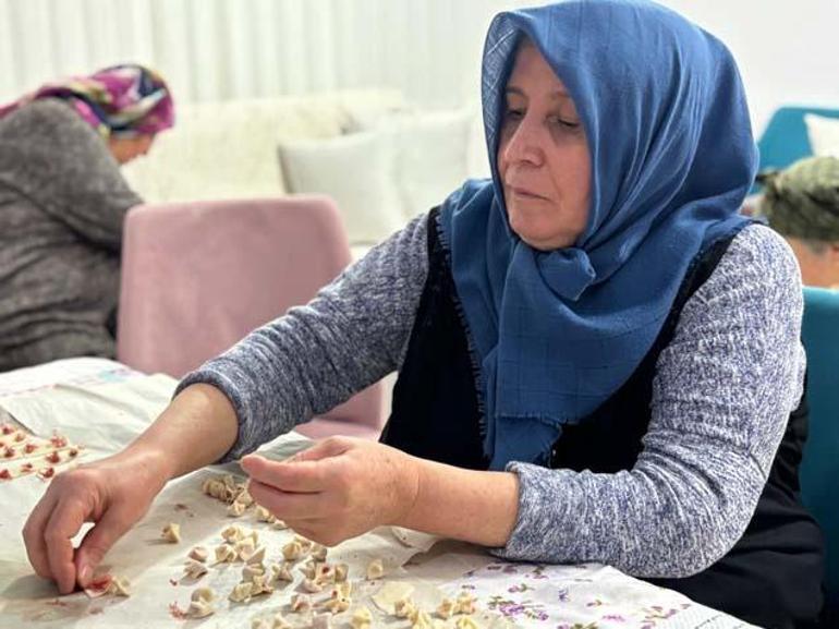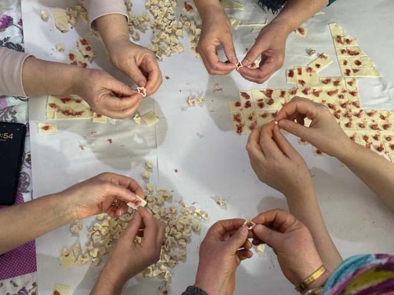 Hamur yoğurma, hamur açma, hamur kesme, mantı katlama, pişirme ve serme işleri için görev dağılımı yapan kadınlar, erken saatlerden itibaren kollarını sıvayıp işe koyuluyor.