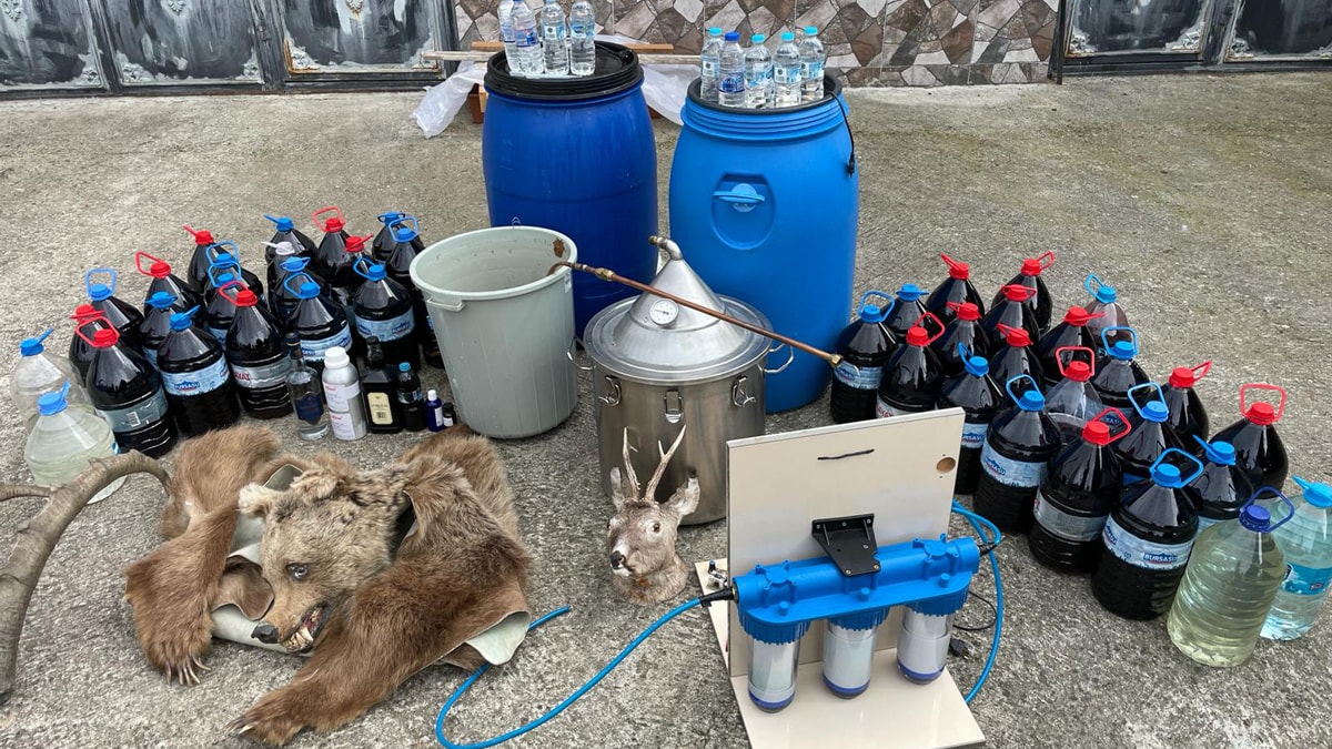 Operasyonda, 450 litre sahte şarap, 15 litre etil alkol, 1 litre anason yağı, içki damıtma düzeneği, içki arıtma düzeneği ile ayı postu, doldurulmuş karaca başı ve dağ keçisi boynuzu bulundu.