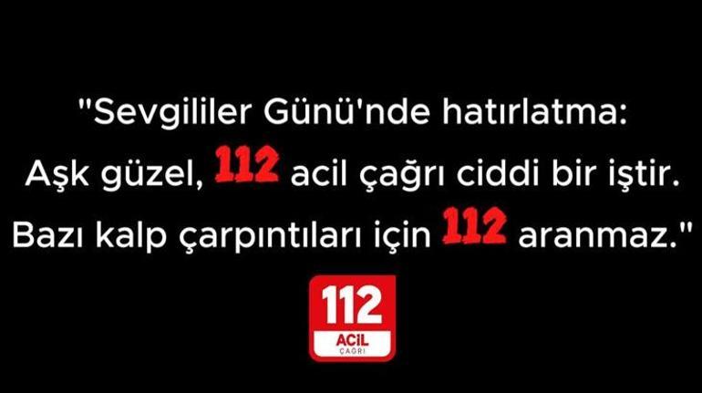 112 Acil Çağrı Merkezi yetkilileri, ‘Sevgililer Gününde Hatırlatma” uyarısı yaparak, “Aşk güzel, 112 Acil Çağrı ciddi bir iştir. Bazı kalp çarpıntıları için 112 aranmaz’ notu düştü.