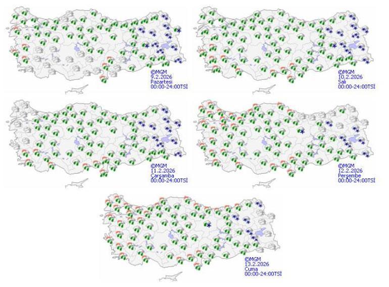 Meteoroloji Genel Müdürlüğü olarak yapılan değerlendirmelere göre: Ülkemiz genelinin parçalı ve çok bulutlu, Mersin ve Karaman hariç yurt genelinin aralıklı yağışlı geçeceği tahmin ediliyor. Yağışların genellikle yağmur ve sağanak, Doğu Anadolu’nun doğusu, Sivas, Bayburt, Bingöl ve Tunceli çevreleri ile Doğu Karadeniz’in yüksek kesimlerinde karla karışık yağmur ve kar şeklinde olması bekleniyor. Yağışların, Doğu Karadeniz kıyıları, Güneydoğu Anadolu’nun doğusu, İstanbul, Kocaeli, Sakarya, Yalova, Bursa, Çanakkale, Aksaray, Niğde, Ordu, Hakkari, Bitlis, Bingöl, Muş ve Şırnak çevreleri ile Balıkesir’in kuzey kesimlerinde yer yer kuvvetli olacağı tahmin ediliyor. Sabah ve gece saatlerinde doğu bölgelerde buzlanma ve don olayı bekleniyor. Doğu Karadeniz’in iç kesimlerinin yüksekleri ile Doğu Anadolu’nun doğusunda yüksek kar örtüsüne sahip eğimli kesimlerinde çığ tehlikesi bulunmaktadır.