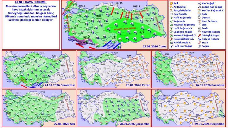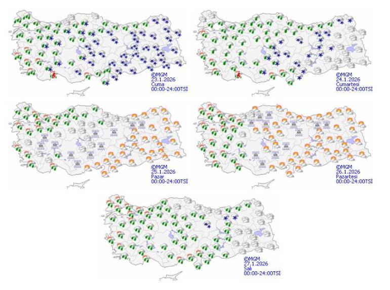 Meteoroloji Genel Müdürlüğü tarafından yapılan tahminlere göre: Ülkemiz genelinin parçalı ve çok bulutlu, Marmara, Ege, Akdeniz, İç Anadolu, Batı ve Orta Karadeniz’in iç kesimleri, Güneydoğu Anadolu, Doğu Anadolu’nun güney ve batısı (Hakkari ve Van hariç) ile Ordu ve Giresun’un iç kesimlerinin yağışlı geçeceği tahmin ediliyor. Kıyı kesimlerde sağanak ve gök gürültülü sağanak, iç ve batı kesimlerde yağmur ve karla karışık yağmur, yükseklerinde ve yağış beklenen doğu kesimlerde kar şeklinde görülecek yağışların, Marmara ve Ege’nin batısı, Batı Akdeniz, Doğu Akdeniz’in doğusu ile Güneydoğu Anadolu’nun batısında kuvvetli, Ege ve Batı Akdeniz kıyılarında ise yer yer çok kuvvetli ve şiddetli olması bekleniyor. Doğu Karadeniz’in iç kesimlerinin yüksekleri ile Doğu Anadolu’nun doğusunda yüksek kar örtüsüne sahip eğimli kesimlerinde çığ tehlikesi bulunmaktadır.