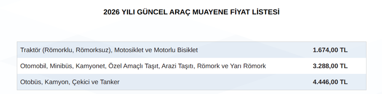 ARAÇ TÜRÜNE GÖRE 2026 MUAYENE ÜCRETLERİ