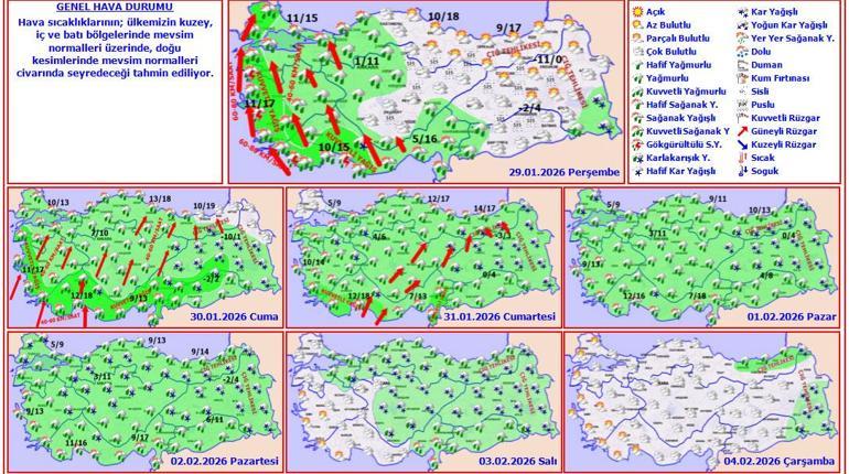 “Edirne, Kırklareli ve Çanakkale, Balıkesir’in batısı, İzmir, Manisa, Aydın, Denizli ve Muğla’da kuvvetli, İzmir’in güneybatısı ile Aydın ve Muğla kıyılarında yer yer çok kuvvetli sağanak ve gök gürültülü sağanak bekleniyor. Marmara’nın batısı ve Kıyı Ege ile İç Ege ve Marmara’nın güneyinde, Batı Akdeniz, Konya’nın güney ve batısı ile Karaman’ın doğusunda kuvvetli rüzgar ve fırtına bekleniyor.”