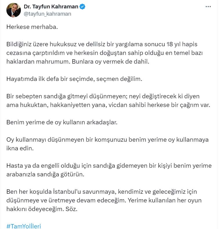 Bildiğiniz üzere hukuksuz ve delilsiz bir yargılama sonucu 18 yıl hapis cezasına çarptırıldım ve herkesin doğuştan sahip olduğu en temel bazı haklardan mahrumum. Bunlara oy vermek de dahil.