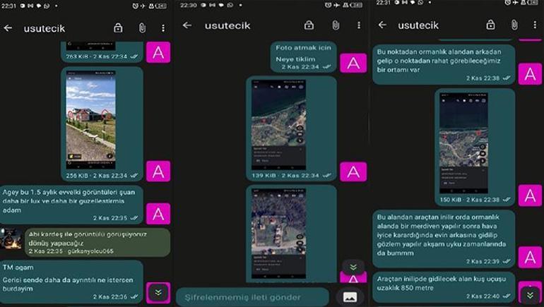 Mesajla haberleştiği kişiye evin fotoğraflarını atan B.K.’nin, güvenlik kameralarını kırmızı daire içine alarak işaretlediği görüldü. B.K.’nin bilgisayardan indirdiği eve ait fotoğrafla yetinmediğini, ayrıca bölgede keşif de yaptığını değerlendirilirken, ‘Usutecik’ kod adlı örgüt üyesine, eve ait fotoğrafta bir bölümü işaretleyerek, “Bu noktadan ormanlık alandan arkadan gelip o noktadan rahat görebileceğimiz bir ortamı var. Bu alandan araçtan inilir orada ormanlık alanda bir merdiven yapılır, sonra hava iyice karardığında evin arkasına gidilip gözlem yapılır. Akşam uyku zamanlarında da bummm” şeklinde mesaj attığı görüldü. B.K.’nin farklı bir zamanda da ‘Usutecik’ kod adlı örgüt üyesine, “Bana susturuculu bir uygun yollu dönme bul kardaşım” şeklinde mesaj attığı ve suikastta kullanacağı silahı temin etme noktasında yardım istediği belirlendi.