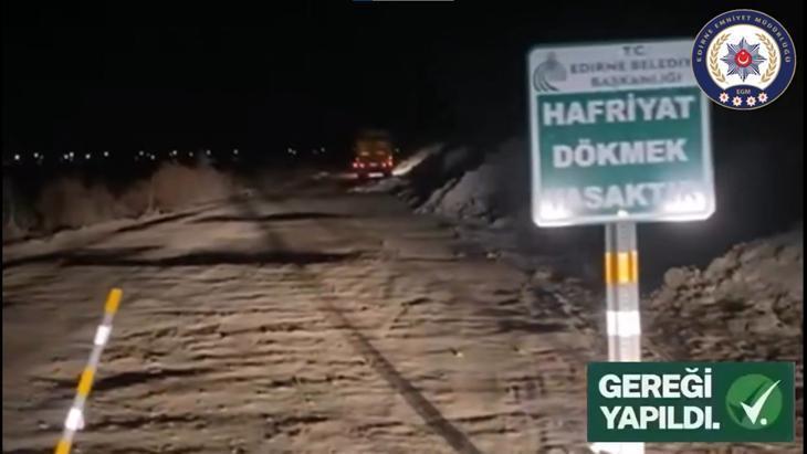 Edirne Valiliği’nin sanal medya hesabından yapılan paylaşımda, “Gereği yapıldı. Yola hafriyat döken sürücü yakalandı. Trafik güvenliğini tehlikeye atan ve çevreye zarar veren hiçbir ihlale müsamaha gösterilmeyecek, denetimlerimiz kararlılıkla devam edecektir. Trafik güvenliğini ve çevreyi tehdit eden durumları 112 Acil Çağrı Merkezi’ne bildirelim. Biz gereğini yaparız” ifadeleri kullanılarak, olayın görüntülerine yer verildi.